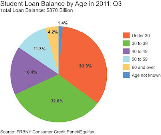 But student debt has mushroomed. In the last decade student debt has quintupled. For the first time, Americans owe more for their education than credit card debt. Consequently, this chart shows delinquencies for student loans are also increasing:The last pie chart shows the amount of debt categorized by age group, with the under forty burdened with more than 65% of the outstanding student debt and fewer jobs to pay for it all.